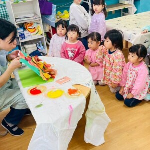「まつぼっくり」の歌を、歌詞が「さ」のところで、手を叩いたり、おサルになったり。。。ちょっと難しいけど、2歳児さんは、上手にできましたよ🎵