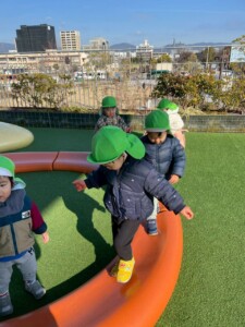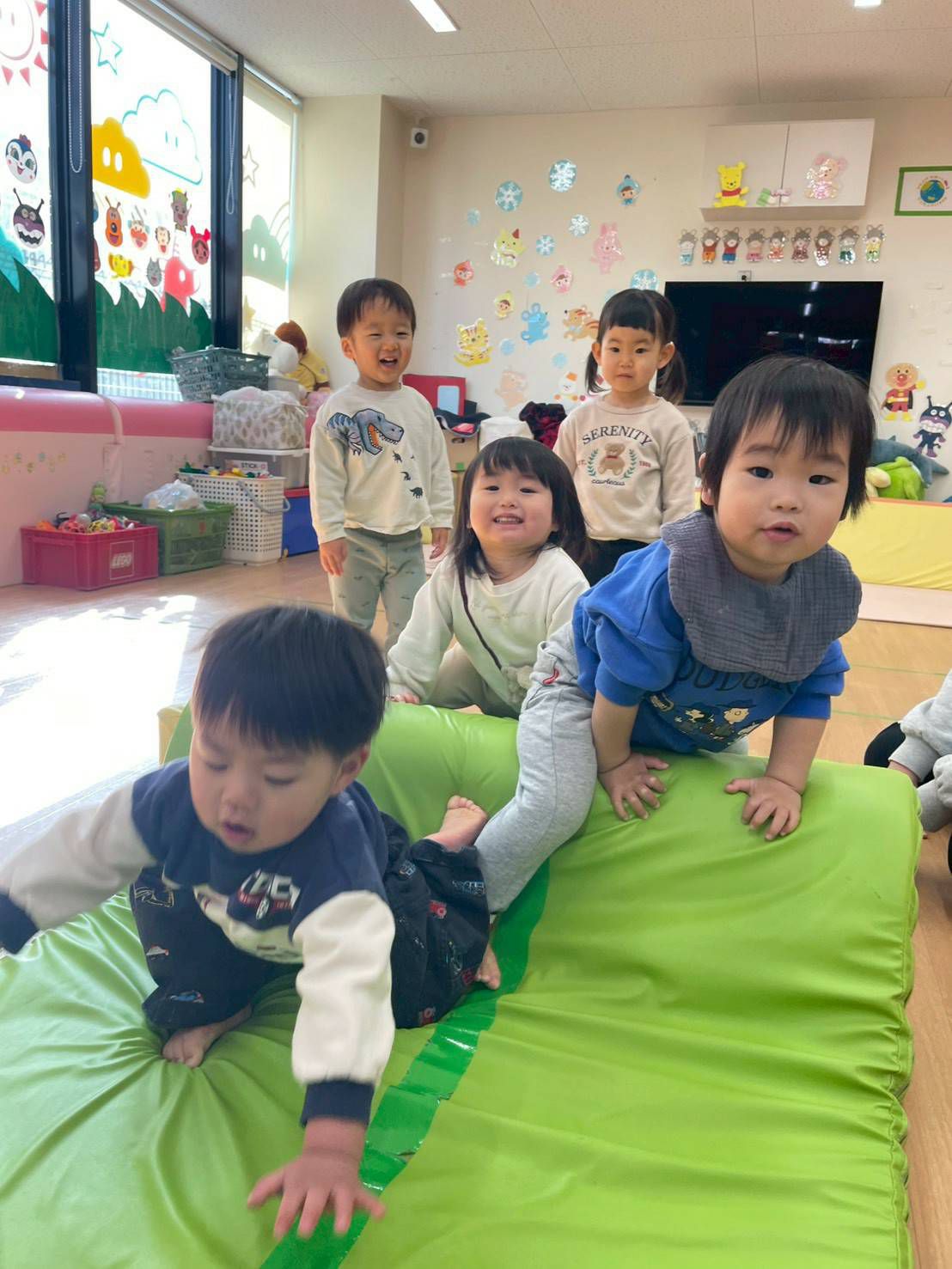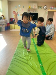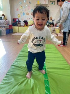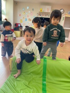 マット山にするとはいはいでよじ登ってそのまま降りていましたが、1人が立ったまま登り降りし始めるとみんなも真似していました。