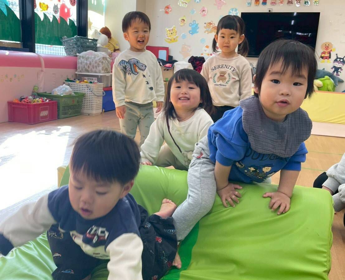 今日はマット運動でした✨✨ マットの上をうさぎになってジャンプ🐰 両足でジャンプ出来る子も増えてきました👍 マット山にするとはいはいでよじ登ってそのまま降りていましたが、1人が立ったまま登り降りし始めるとみんなも真似していました。 ジャンプで降りる子もいましたよ😃 おにクルの2階のテラスへお散...
